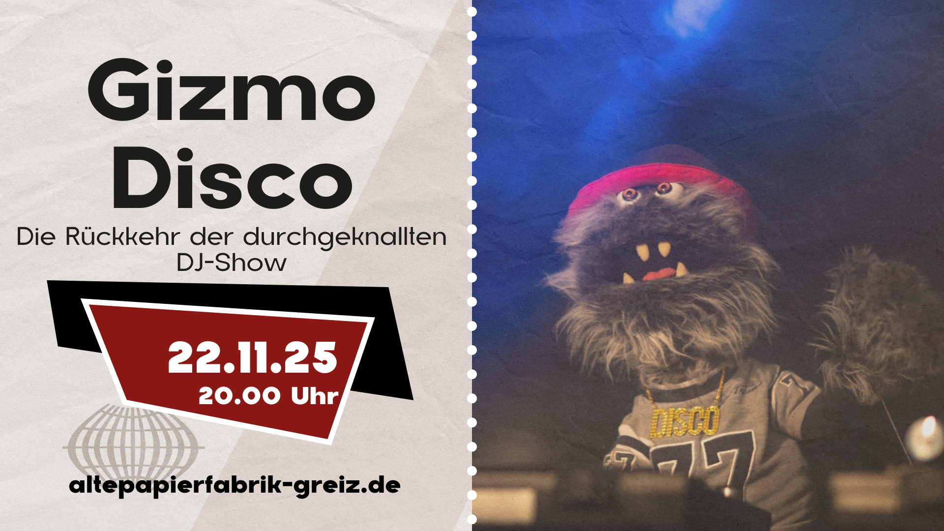 Seid dabei, wenn die Gizmo-Disco wieder die Alte Papierfabrik in einen schillernden Party-Kosmos verwandelt!