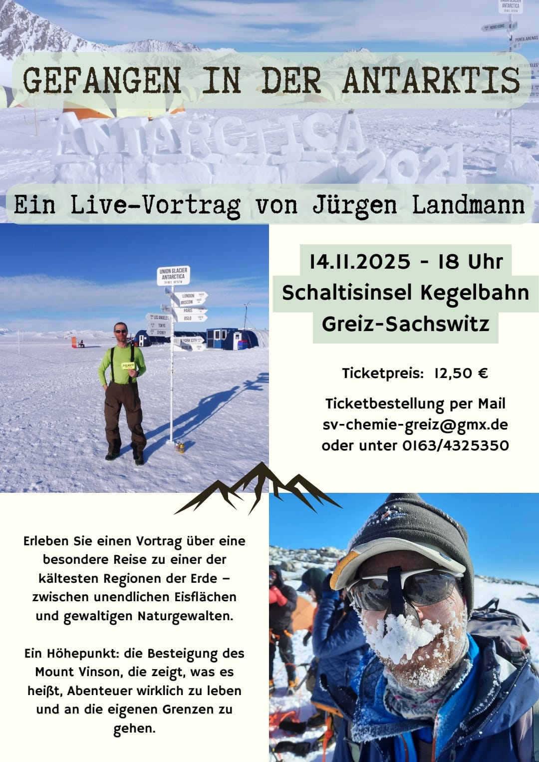 Veranstaltungskalender Gefangen in der Antarktis Live-Vortrag Termin Freitag, 14.11.2025 18:00 Uhr Veranstaltungsort Sportplatz Schaltisinsel GreizSchaltisweg07973 Greiz Veranstalter SV Chemie Greiz e.V. Liebigstr.7 07973 Greiz Telefon: 01634325350 2025_11_14 Paginierung Zurück zur Übersicht