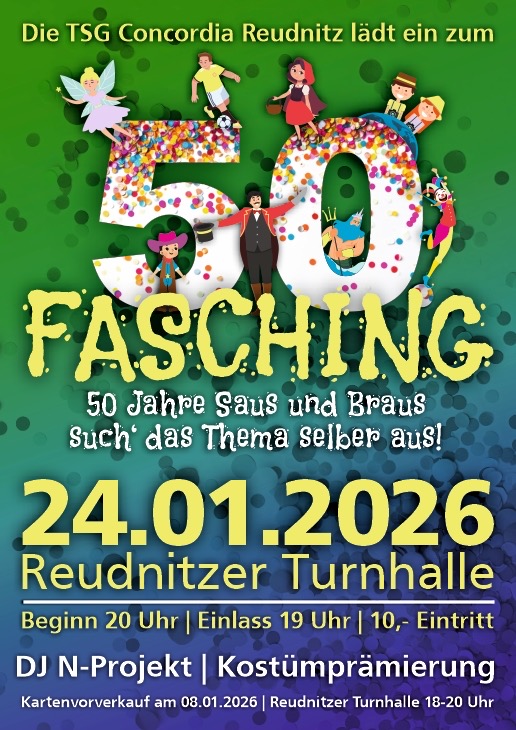 Veranstaltungskalender Fasching - 50 Jahre Saus und Braus, such das Thema selber aus! Termin Samstag, 24.01.2026 20:00 Uhr Veranstaltungsort Turnhalle ReudnitzGottesgrüner Straße 107987 Mohlsdorf-Teichwolframsdorf Veranstalter TSG Concordia Reudnitz Hermann-Löns-Str. 4 07973 Greiz Ansprechpartner: Katrin Siebach E-Mail: katrin.siebach@web.de Fasching Reudnitzer Einlass: 19 Uhr Beginn: 20 Uhr Mit DJ N-Projekt und Kostümprämierung Paginierung Zurück zur Übersicht