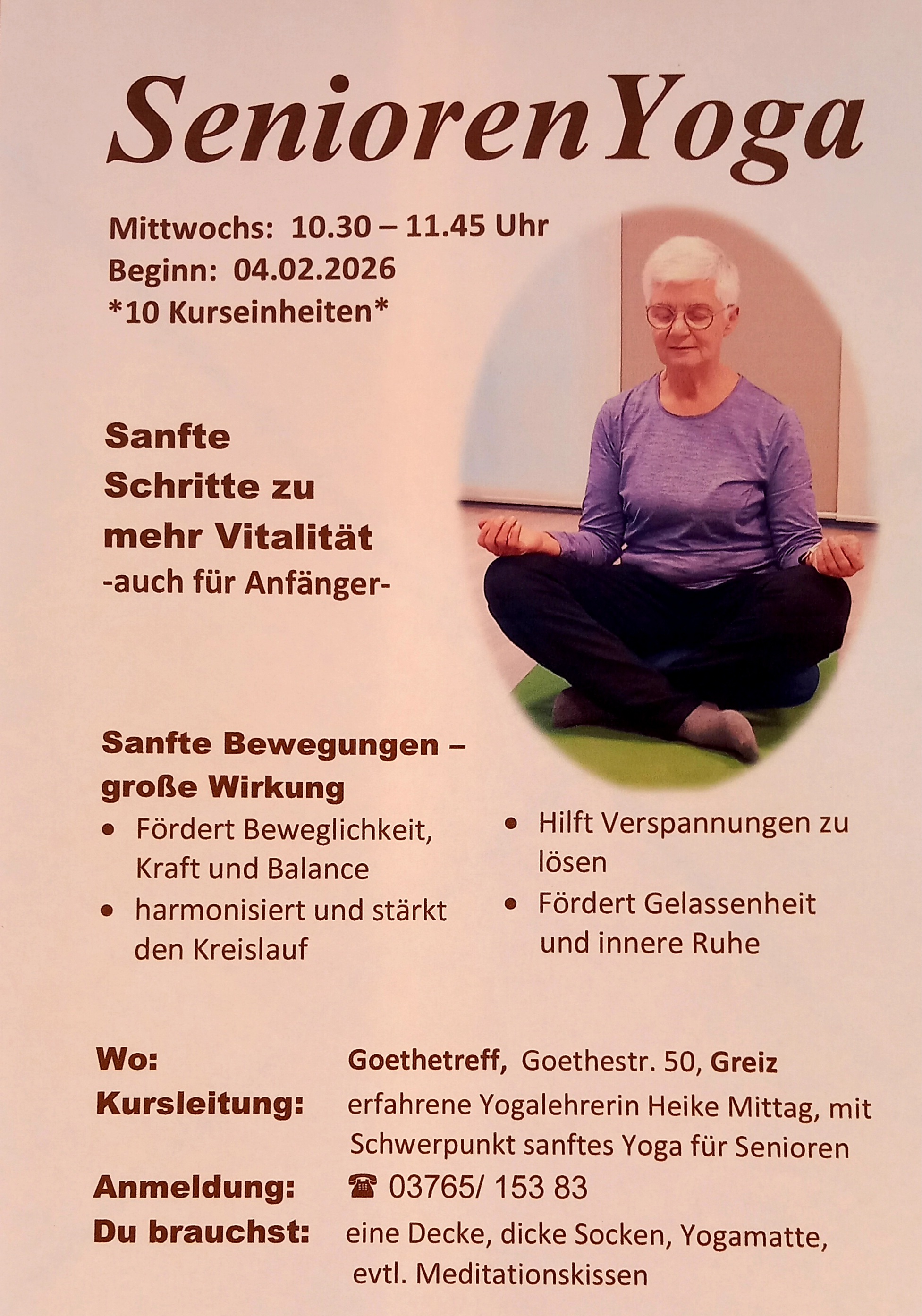 Senioren Yoga ist ein Hathayogakurs, 10 Einheiten, speziell abgestimmt auf Senioren, Grundstellungen mit Variationen, Atmung, Entspannung/Tiefenentspannung