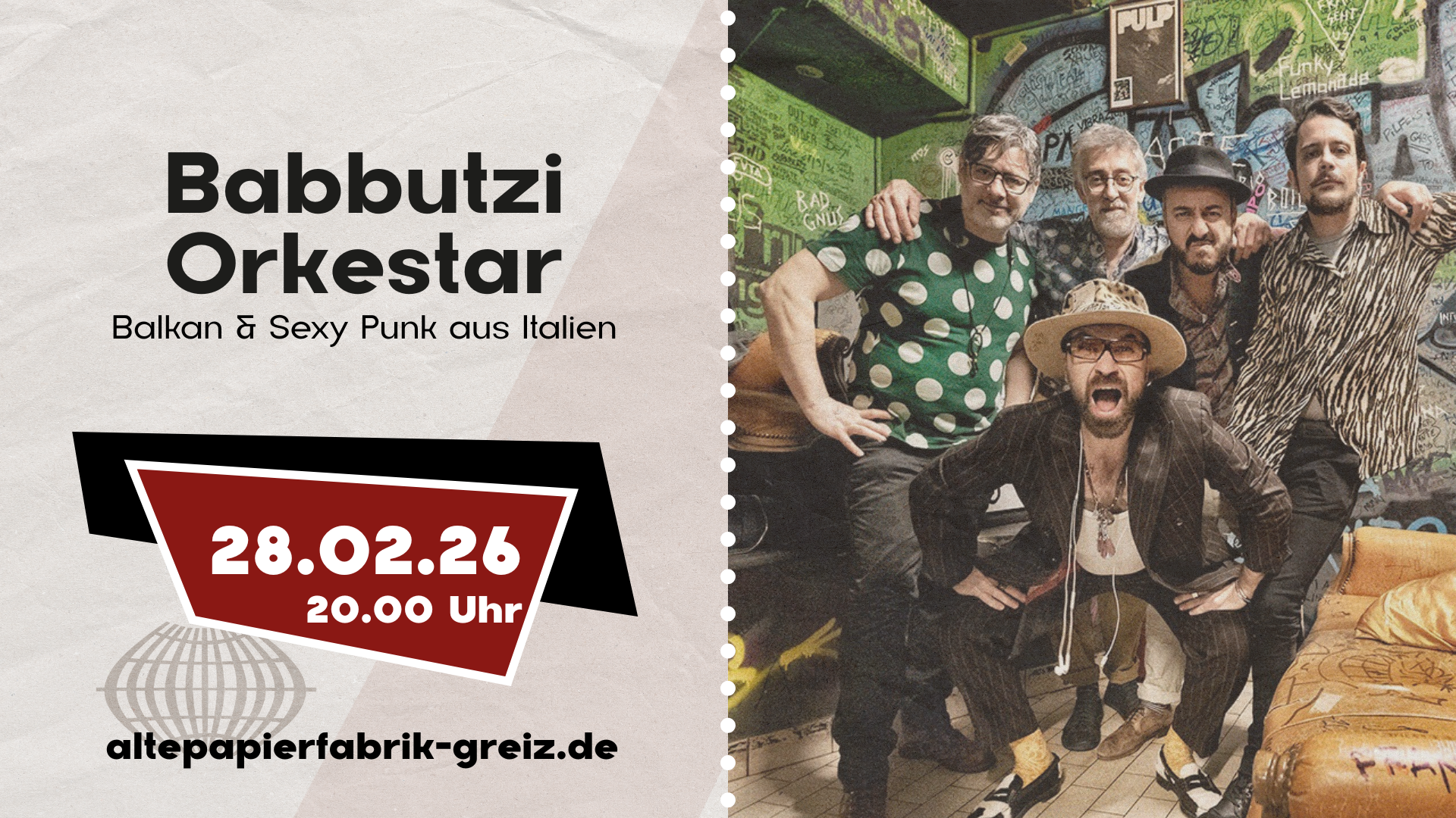 Das Babbutzi Orkestar, gegründet 2007, bringt eine erfrischende Kombination aus Balkanmusik und traditionellen osteuropäischen Klängen auf die Bühne der KulturGarage. Ihr einzigartiger Sound verbindet treibende Rhythmen, lebhafte Bläser und tanzbare Polka‑Momente zu einem energiegeladenen Live-Erlebnis.
