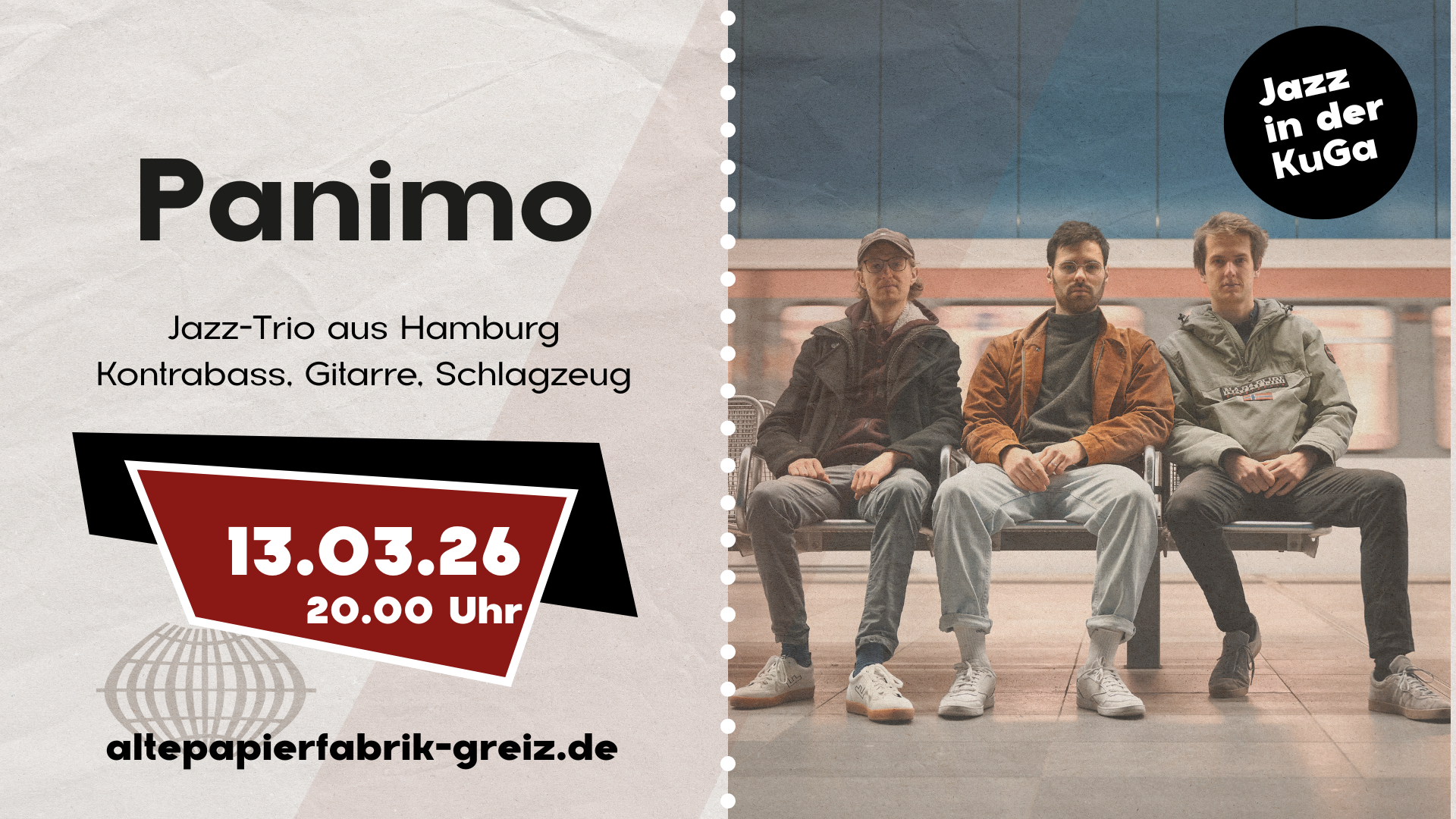 Panimo, ein zeitgenossisches Trio aus Hamburg, vereint eingangige Melodien, komplexe Rhythmen und dichte Harmonien zu einem charakteristischen Klangbild. Lucas Kemmlers Kompositionen bilden das Zentrum, ergänzt durch das präzise Zusammenspiel von Timon Krämer am Kontrabass und Henning Katz am Schlagzeug, wodurch Spannungsbögen zwischen Einfachheit und komplexer Feinheit entstehen.