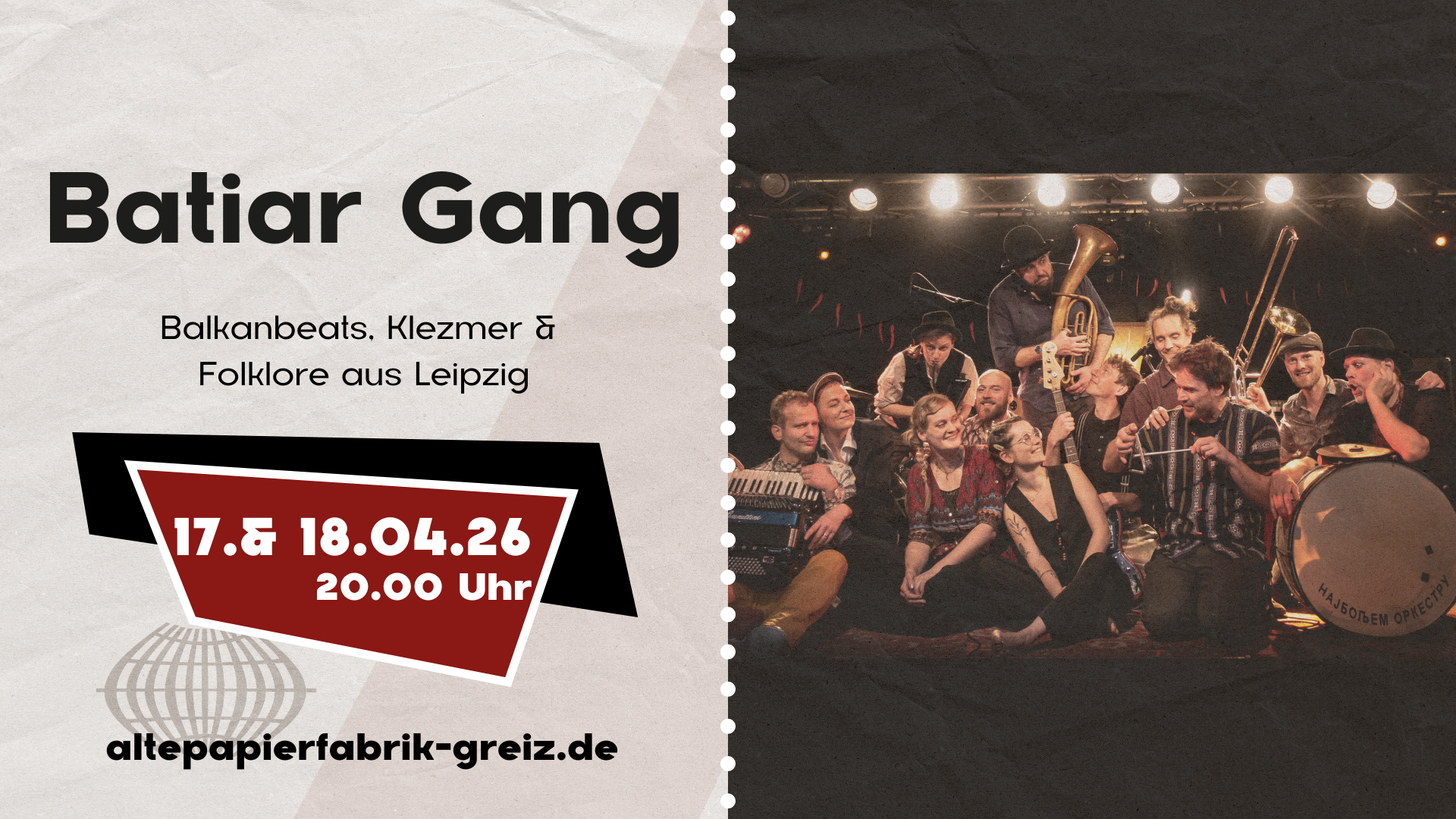 Das einzigartige Kollektiv aus klirrendem Gebläse der Trompeten, Saxophone und Klarinette ist gleich an zwei Abenden in unserer Kulturgarage, mit viel BummBumm, funzigem Bass und dazu einzigartigen, mehrstimmigen Gesängen Südosteuropas. Batiar Gang serviert ein tanzbares, schweißtreibendes Programm aus Liedern der zehnjährigen Bandgeschichte, entstanden unterwegs in Serbien, Bosnien, Mazedonien, Bulgarien, Rumänien und der Ukraine.