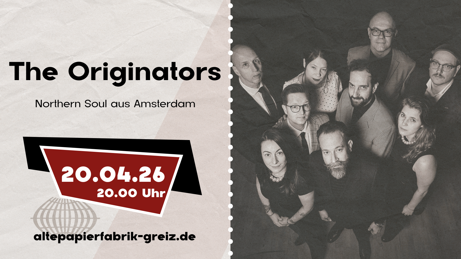 Zeitreise in die Northern Soul-Ära: The Originators aus den Niederlanden bringen handgemachten Groove und präzise Arrangements in die Alte Papierfabrik Greiz. Mit ihrem starken Rhythm & Soul schaffen sie eine mitreißende Atmosphäre, die sofort zum Tanzen einlädt.Die Band überzeugt durch musikalische Präzision, Spielfreude und einen authentischen Sound, der die 60er-Jahre aufleben lässt. Ihr Repertoire verbindet energetische Live-Performance mit liebevoll gestalteten Arrangements und sorgt für unvergessliche Momente.
