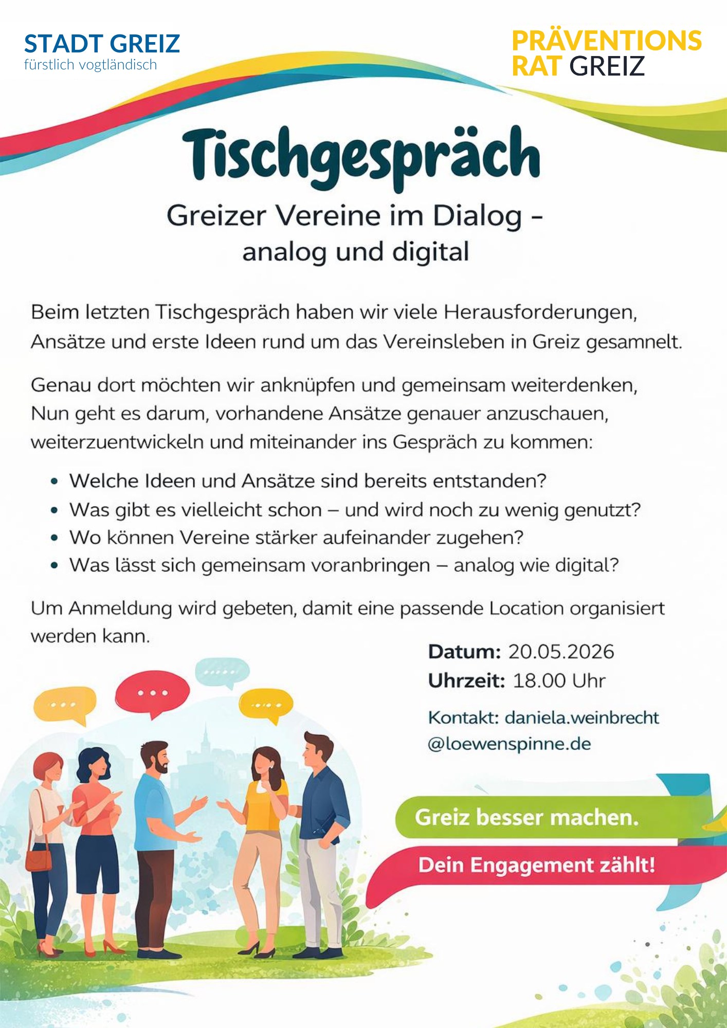 Das erste Tischgespräch "Vereine im Dialog" hat gezeigt: Es gibt viele Gedanken, Ideen und Energie rund ums Vereinsleben in Greiz – und die wollen wir gemeinsam weiterentwickeln!